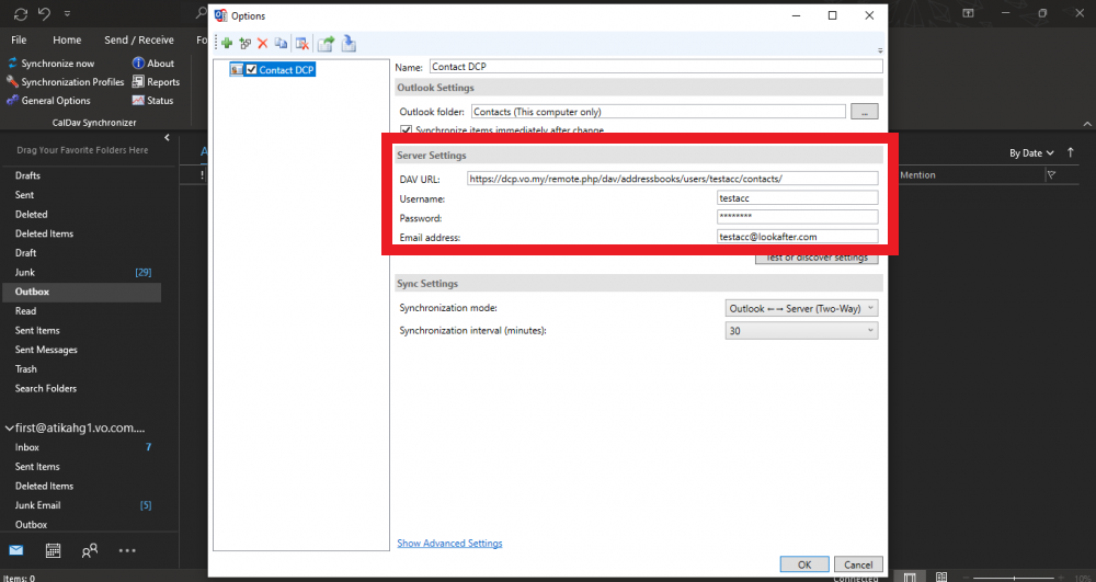 8. Under Server Settings, paste the copied link in the DAV URL. Fill in your DCP login details in the provided fields which are your DCP's username, password and email address.