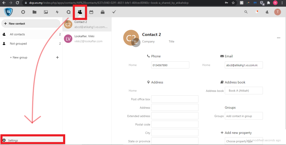 1. First, please login to your DCP and go to [ Contact ]. Then, click on [ Settings ].