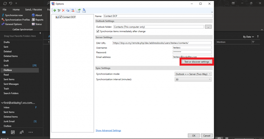 9. Click on [ Test or discover settings ] to verify your settings.