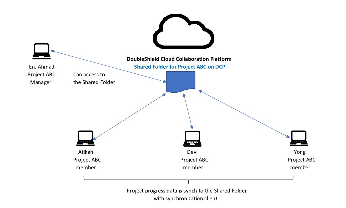Shared Folder on DCP through synchronization client. In the previous example, when Atikah placed Project ABC Week 1 file into her local folder, the file would sync up to Atikah's Folder (the sub-folder) under the Project ABC Shared Folder on DCP. The file would not be synched down to other members but other members may still view the file from Atikan's Folder on DCP.