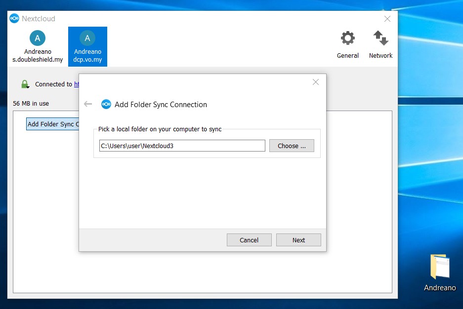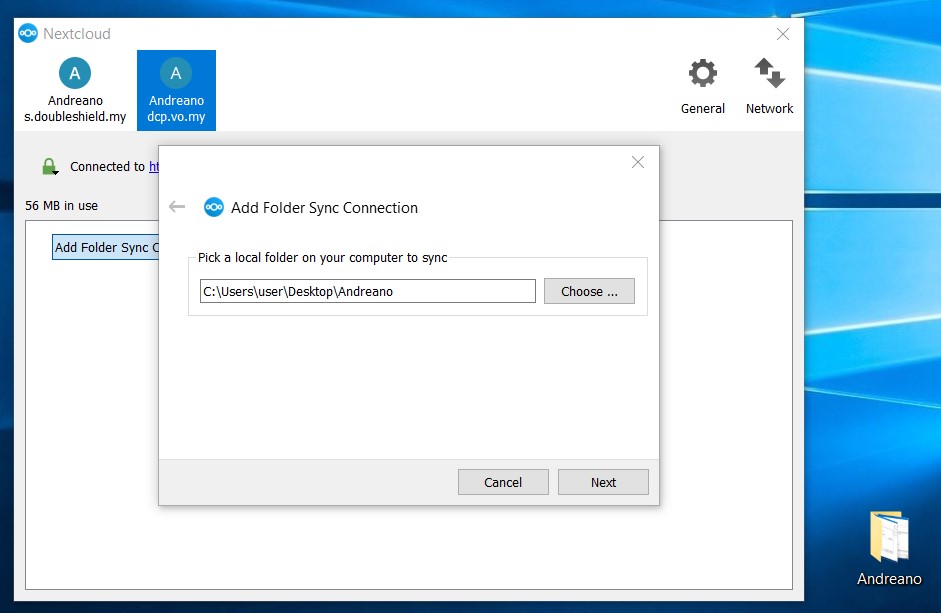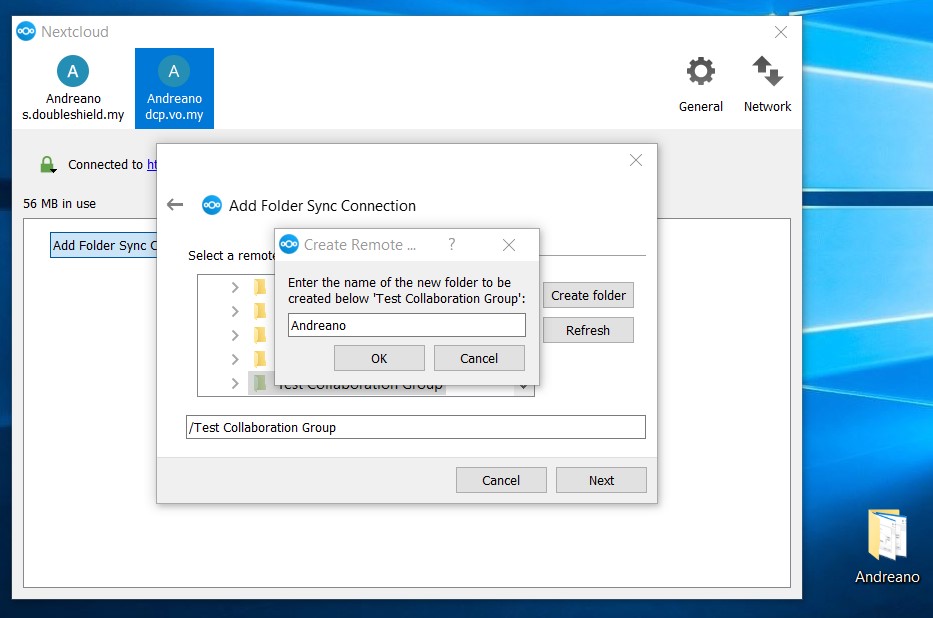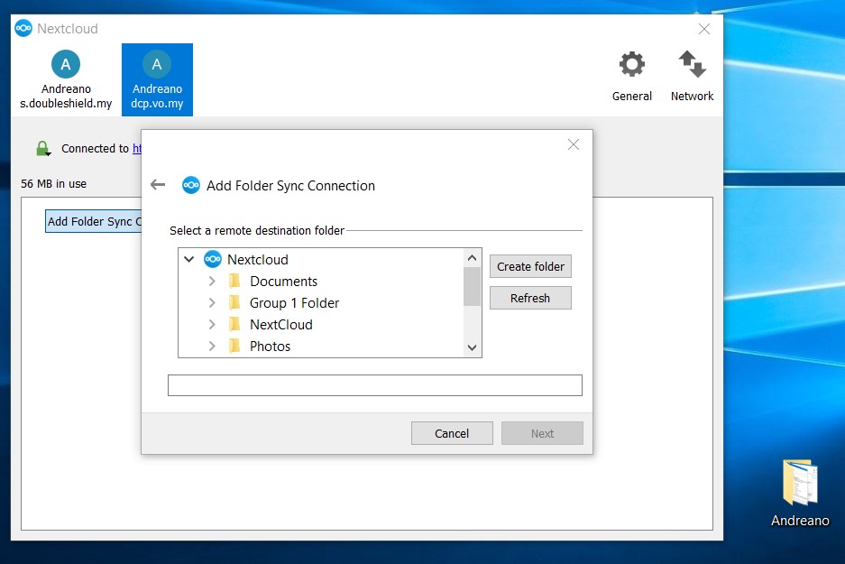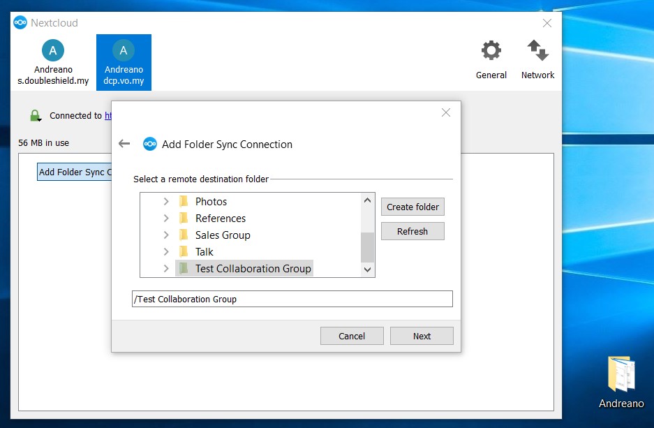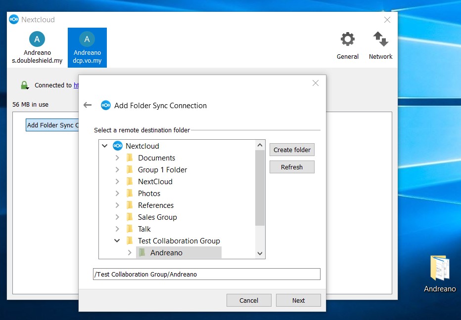 6. As seen below, the folder “Andreano” created to be sub-folder for a Group Folder has been selected then click “Next”.