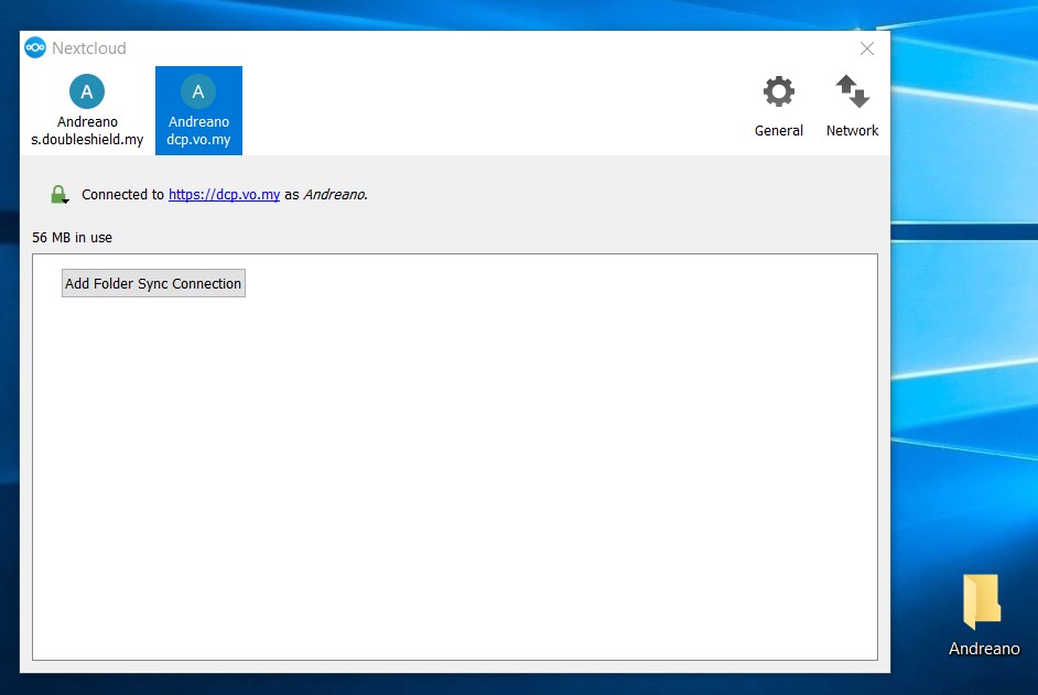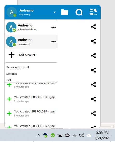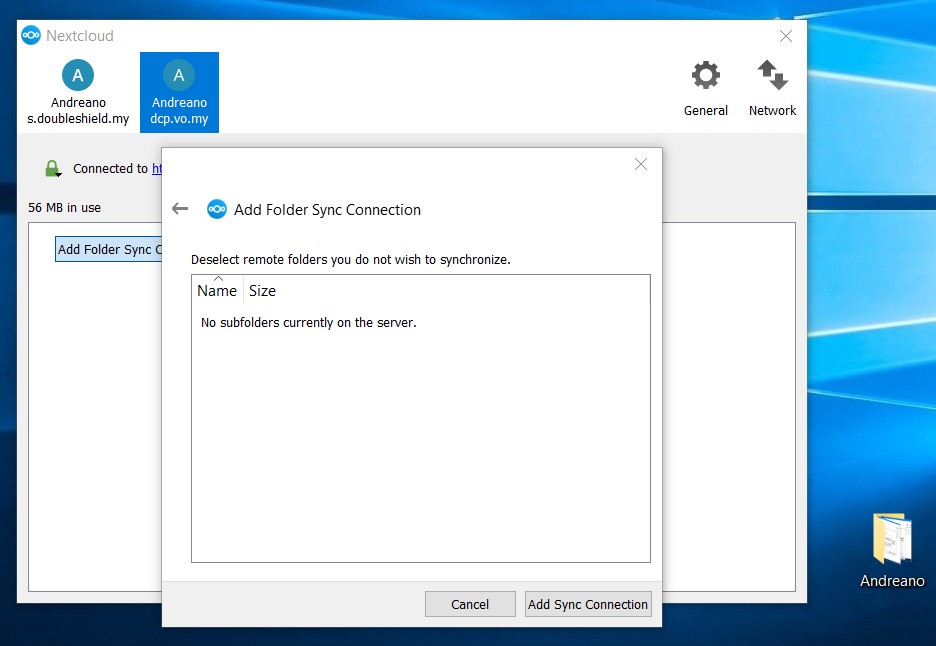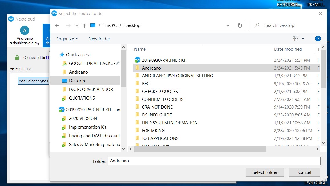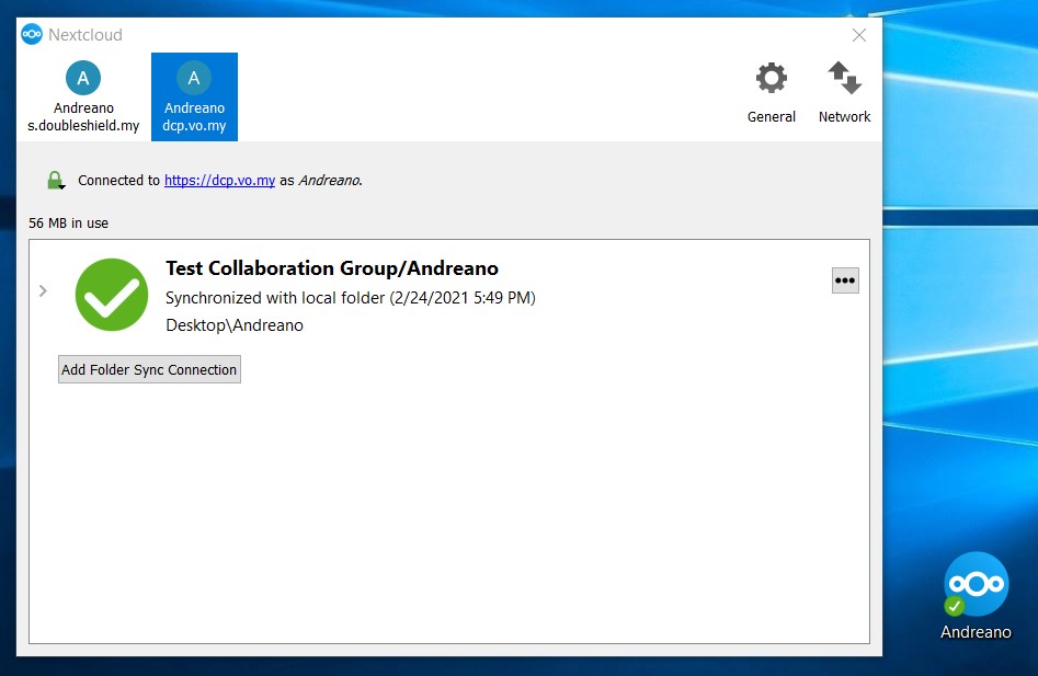 12. Once the sub-folder has been synced up to DCP, you’ll see as follows and also notice the folder icon for “Andreano” sub-folder on the local desktop has changed to the sync client logo with green tick, meaning it is connected & synching.