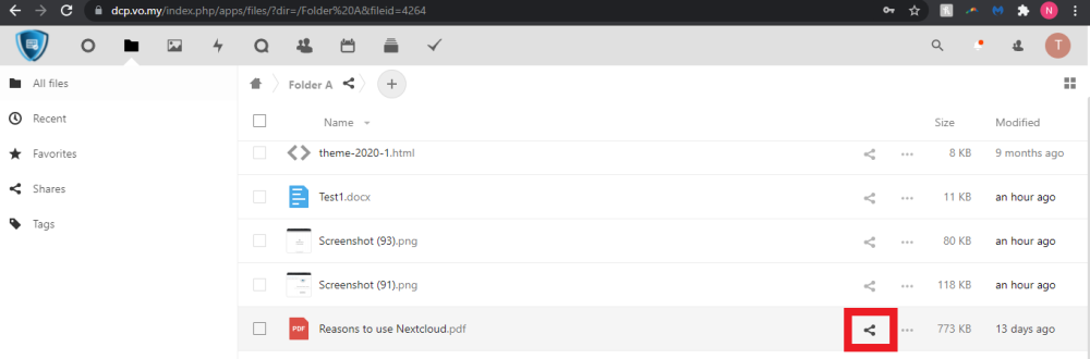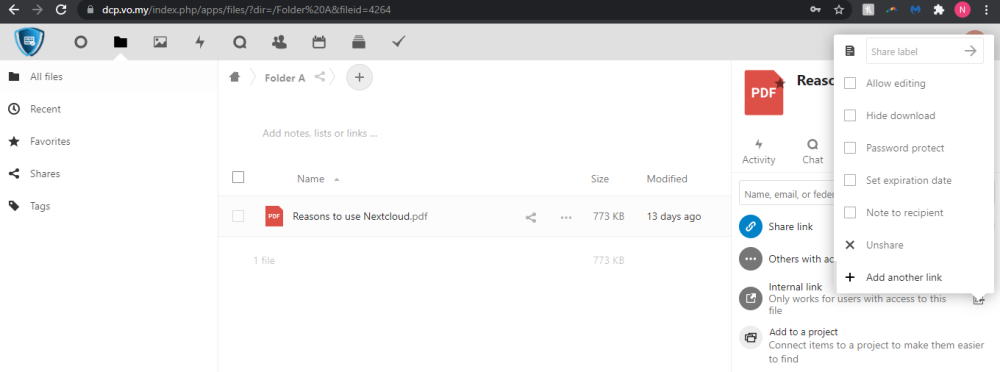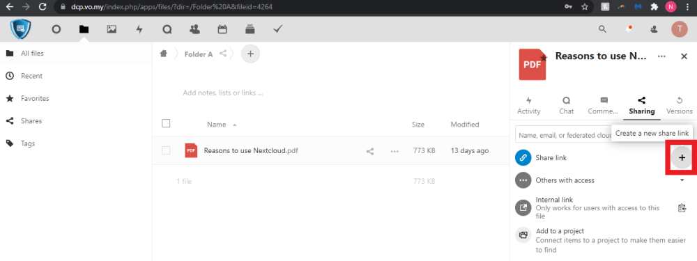 5. You may also share the file/folder via share link by clicking on the + icon as shown below.