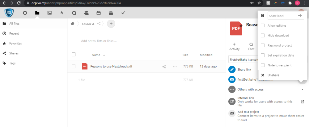 You may select [ X Unshare ] if you wish to no longer share the file or folder.